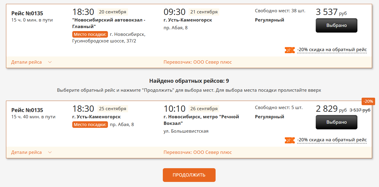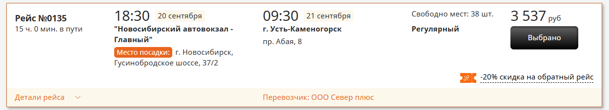 На официальном сайте новосибирского автовокзала nskavtovokzal.ru открыта продажа билетов по маршруту "Новосибирск — Усть-Каменогорск — Новосибирск" со скидкой 20% на обратный билет при одновременной покупке билетов туда и обратно перевозчика ООО «Север плюс».