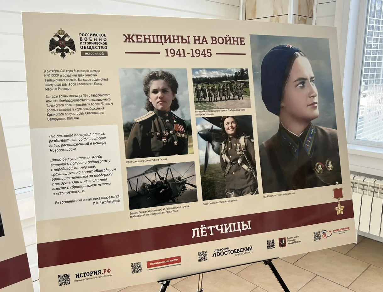 На стендах представлены архивные фотографии и истории лётчиц, танкистов, педагогов, матерей-героинь и других участниц военных событий, внёсших вклад в Победу.
